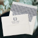 Elegant wedding envelopes featuring a simple laurel wreath framing the couple's initials. Inspired by 1920s design, it blends classic formality with modern flair, using a traditional serif font, and matching leaf pattern printed inside. You can personalise the template with the couple's names, monogram, and return address — all the text can be customised to suit your occasion. Perfect for invitations, save the date cards, bridal showers, rehearsal dinners, or personal stationery. Printed colours: very dark navy blue, and off-white, ivory cream. Shop the collection for matching stationery and supplies for sale online!