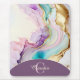 A feminine elegant liquid ink design in pink, purple, turquoise and gold. Personalised with monogram and name.