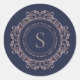 Elegant Monogram Modern Navy Copper Blush Classic Round Address Envelope Seal. Beautiful stickers with blush and grey coloured text on navy blue adorned with a lovely single letter monogram in a copper blush coloured circular frame. Personalise with your wedding details. We invite you to visit our store, Austen & Grace, to view more of our designer wedding invitation suites. Please contact us if you require extra matching products or any assistance via the contact button or email directly at contact@austenandgrace.com