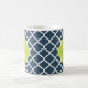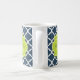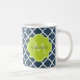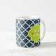 An elegant navy blue quatrefoil patterned mug with a scalloped badge in a vibrant spring green that you can personalise by adding your name and monogrammed initial to. This is part of the Sailor Blue and Lime Punch Spring Collection.