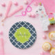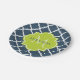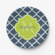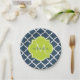 Elegant navy blue quatrefoil patterned paper plates with a scalloped badge in a vibrant spring green that you can personalise by adding your name and monogrammed initial to. This is part of the Sailor Blue and Lime Punch Spring Collection.
