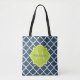 An elegant navy blue quatrefoil patterned tote bag with a scalloped badge in a vibrant spring green that you can personalise by adding your name and monogrammed initial to. This is part of the Sailor Blue and Lime Punch Spring Collection.