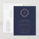 Elegant Monogram Navy Wedding Invitation. Beautiful wedding invitations with grey and blush coloured text on navy blue adorned with a lovely single letter monogram insignia with a copper blush circular frame. Personalised with your wedding details. Postcard back (all elements on back are customisable). Visit our store, Austen & Grace, to view more of our designer wedding invitation suites. Please contact us if you require extra matching products or any assistance via the contact button or email directly at contact@austenandgrace.com