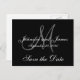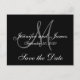 Black Grey Monogram Modern Save the Date postcard. Elke Clarke© for MonogramGallery at Zazzle. Elegant, simple wedding announcement with a grey monogram initial in script typography with white text overlay on a black background. Fully customisable. Other colours and background effects available.