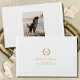 This elegant wedding guest book features a custom photo, and a simple laurel wreath framing the couple's initials. Inspired by 1920s invitations, it blends classic formality with modern flair, using a traditional serif font, vintage calligraphy script and a clean arrangement. Personalise the template with the couple's names, monogram, photo, date and location. Perfect for capturing guests' special messages and fun memories. Printed colours: gold and white. Shop the collection for matching stationery and supplies for sale online!