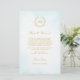 This elegant timeless classic wedding design combines classic laurel wreath enclosing Bride’s and Groom’s monograms and a light turquoise watercolor ombre. Gold lettering (gold is not real gold but colour). Elegant font combo.