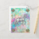 A very elegant unicorn postcard with a beautiful white unicorn with long flowing mane and tail, trotting across an abstract rainbow landscape. Around him is a thin, gold metal frame which has been embedded with monogrammed jewels at the corners. The jewels can be personalised to whatever monogram you wish. This pretty card would make a great birthday card for a unicorn-loving teen, all-occasion greeting card or even look great just popped in a frame and hung on a child's bedroom wall for a much-loved unicorn decoration (for instance).