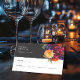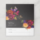Embrace the opulent beauty of a fall floral harvest with our captivating wedding place card. A dramatic, yet soft black background provides the perfect canvas for a breathtakingly realistic bouquet. Imagine a vibrant explosion of colour, featuring roses in orange and dark magenta, with small magenta pink flowers and purple violets and alongside peach mums and other vibrant florals. Lush, dark green foliage completes the arrangement, adding a touch of natural elegance. This captivating design is perfect for any season, reflecting the passionate intensity of your love story. Your wedding details are showcased in elegant script, ensuring they stand out beautifully against the dramatic backdrop. This enchanting design creates a truly unforgettable addition to your special day. Created by Simply Farmhouse Press.
