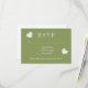 Elegant moss green RSVP wedding response cards for reply. Give your guests a way to respond if they are coming or not to your elegant wedding. This design goes together with wedding reception invitations and other items of a classy matching themed collection set. Customisable text and paper quality. Rustic love heart symbol design for bride and groom couple. Trendy custom colour themes for marriage. Stylish script typography template. R S V P accepts with pleasure, total number of guests, declines with regret.