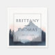 This is a minimalist style image featuring an elegant wedding invitation with the names "Brittany and Thomas" set against a serene mountain backdrop. The soft pastel colors of dawn or dusk create a tranquil, romantic atmosphere, while the silhouettes of trees add depth to the composition. It feels like a peaceful retreat in nature, perfect for inspiring love and tranquility on your special day.