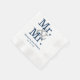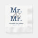 Wedding napkins feature a "Mr. & Mr." ampersand design in navy blue and grey serif fonts (colours can be customised) with custom monogram text that can be personalised with the grooms' first names and married last name, as well as their wedding date.