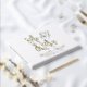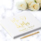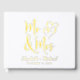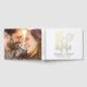 Elegant white wedding guest book featuring "Mr & Mrs" in a large script, an illustration of two hearts joined together, and your first names and wedding date, all rendered in your choice of real gold, silver or rose gold foil. Personalise your title on the spine and add your favourite engagement photo on the back.