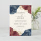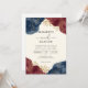 This design features a sophisticated blend of deep navy blue and rich burgundy hues, artfully marbled with accents of shimmering gold botanical elements. The abstract watercolor-like splashes create a luxurious and organic feel, perfect for a modern yet elegant affair. Its dramatic colour palette evokes a sense of timeless romance.