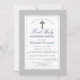 A Classic with a touch of modern First Holly Communion Invitation for boys. The design features a silver grey border, a beautiful grey silver cross, "First Holy Communion" in classic script typography, and all information about the event in dark grey, the design is finished on the reverse with a stripes background in blue navy and white. Customise with the template fields provided or click customise further for more editing option.