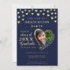 Create a unique photo graduation invitation for the class of 2025 graduate designed in navy blue and gold colours decorated with hearts. Templates make it easy to personalise the invites with your data and upload a photo. Name and Family Name are changed separately to have this stylish curved view. Please use the template to upload your photo to have the same heart-shaped image of the graduate. Try a few photos to choose which one suit best for a heart-shaped image.