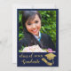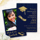 Create elegant graduation invitations with a photo of your graduate on the backside. Use the template to personalise these invites for a class of 2025 graduate or another year. Name, event date, address and RSVP information are also easy to customise using the template. This design is in navy blue and gold colours.