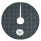 Modern Christmas tree skirt featuring a timeless design with your monogram over a muted navy blue and green plaid background.