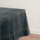Modern Christmas tablecloth featuring a timeless design with a muted navy blue and green plaid pattern.