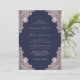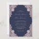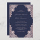 These elegant wedding invitations featuring rose gold floral lace against a navy blue background are perfect for inviting your guests to your navy blue and rose gold rustic wedding party.