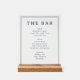 This acrylic sign features a clean, modern layout with a white background and black text, creating an elegant and sophisticated look. The design includes categories for beer, wine, and spirits, each listing popular options in a simple, easy-to-read font. The minimalist style and neutral color palette make it perfect for any bar or home setting, adding a touch of class to your space. Ideal for enhancing the ambiance of gatherings or as a stylish decorative piece, this sign is both functional and visually appealing.