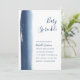 Modern and creative boy baby sprinkle invitation featuring a simple design with a navy blue watercolor brushstroke on the left side, over a white background. On the top right is the event title in a handwritten font, in right alignment. On the bottom left are your event details in a sans serif font, in left alignment. The backside is a solid navy blue. These unique invitations are great for an artistic mum-to-be.