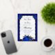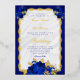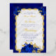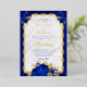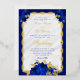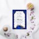 Enjoy luxury at an affordable price with this elegant navy blue floral wedding invitation with REAL GOLD FOIL frame and accents, as well as selected script text. A faux blue metallic background, white satin, and a gold filigree jewelled frame combine with rich royal blue roses for the ultimate elegant wedding design. The text in classic formal fonts can be easily personalised for your own special day. On the back is a decorative script monogram in complementary colours.