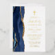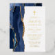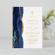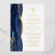 The left-hand edge of this elegant modern first communion invitation features a navy blue watercolor agate border trimmed with faux gold glitter. A small cross appears above the customisable text, which combines handwriting, copperplate and italic fonts in real gold foil on a white background. The reverse side features a matching navy blue and gold agate design. Ideal for a boy's First Communion.