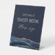 Make your special event even more memorable with this elegant Guestbook Pedestal Table Sign. This beautiful freestanding acrylic entrance sign invites guests to share their well wishes in the accompanying guestbook, while providing chic reception information. The blue background and modern agate design, paired with an elegant gold glitter accent, create a sophisticated look that is sure to impress your guests. The minimalist template highlights the sign's beauty, making it a perfect complement to any décor. Be sure to welcome your guests in style with this guestbook signage creating unforgettable memories that will last a lifetime.