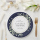 Featuring delicate watercolor greenery leaves on a nav blue background, this chic botanical couples shower paper plate can be personalised with your special event details. Designed by Thisisnotme©