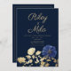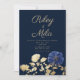 This gorgeous wedding invitation design features a lovely navy blue, and gold simple luxury foliage floral Wedding invitations that are perfect for any classy and sophisticated ceremony. These exquisite elegant floral designs are perfect for stylish couples. Customise this design with your message and personalised information. All designs are printed.
