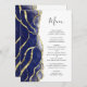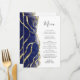 The left-hand edge of this elegant modern wedding menu features a navy blue alcohol ink border trimmed with faux gold foil and faux glitter. The customizable text combines handwriting script and copperplate fonts in charcoal gray on a white background. The reverse side features a matching navy blue and gold design.