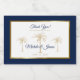 Thank your guests for celebrating with you on your special day with these modern navy blue and gold mini sparkling wine labels featuring the words "Thank you for celebrating with us" and an artistic golden palm tree and elegant gold foil frame over a navy blue background. Easily personalise them with the provided templates for the bride and groom's names and wedding date. If you need help or matching items, please contact me.