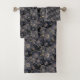 Stylish elegant bath towel set featuring a floral pattern of midnight navy blue with shades of smoky grey and accented hints of metallic gold.