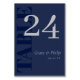 Elegant typography wedding table number cards in muted navy blue with TABLE in large letters down the side of the navy blue table number cards. Add names and wedding date in silver grey.