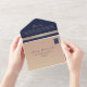 Elevate your wedding celebration with this elegant navy blue and marble all-in-one invitation. Featuring a sophisticated navy and gold design with a photo section, this eco-friendly invitation combines style and convenience. Perfect for modern, chic, or classic weddings. Customise with your details for a personal touch.