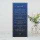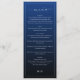 This elegant wedding menu features a sophisticated navy blue background with crisp, clean lines and ample white space for a modern yet timeless look. The layout is organized into distinct sections—Starters, Salad, Main Course, and Dessert—with headings in uppercase serif font and menu items in a simple sans-serif typeface, ensuring clarity and readability. A flowing cursive script at the top adds a touch of personalization, while the contrasting light cream text enhances visibility against the dark backdrop. The minimalist design focuses on refined typography and an understated luxury, making it perfect for high-end dining experiences where the culinary offerings are the star attraction.