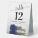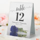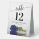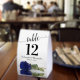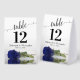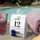 These tent signs will not only help your guests find their tables, they'll also make your wedding reception more beautiful. The design is both elegant and romantic featuring a single navy blue coloured rose lying on its side reflecting in water with waves and ripples. The title is in lacy script calligraphy with bold numbers so your guests can easily find the right table. There is room for the names of the couple and the wedding date.