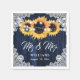 Rustic navy blue and sunflower wedding paper napkins featuring sunflowers, string lights and delicate floral lace on a rustic wood background.