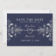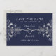 Elegant modern calligraphy script navy blue wedding save the date invitation with simple silver rope heart and gilded floral lace.