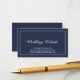 This card features title in white elegant script font with details in white classic serif font and white border on navy blue background.