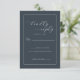 This elegant wedding RSVP card features a sophisticated and minimalist design with a dark, muted color palette that exudes timeless charm. The clean lines and simple layout are complemented by the graceful cursive typography, creating an air of understated elegance perfect for a refined celebration. With ample space for personalization, this card invites guests to respond in style, ensuring your special day is surrounded by loved ones who appreciate its beauty. Ideal for couples seeking a modern yet classic touch for their wedding stationery.