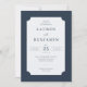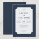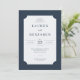 This elegant wedding invitation features a classic vertical layout with a sophisticated navy blue border framing a crisp white background. The design employs a refined serif font for the names and key details, creating a formal and polished look that emphasises clarity and elegance. Ample negative space enhances readability, while the structured composition ensures a balanced and inviting presentation. Perfect for a traditional or formal wedding celebration, this invitation conveys an atmosphere of sophistication and refinement.