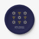 Elegant HAPPY HANUKKAH paper plates showing faux gold and silver STAR OF DAVID and MENORAH in a tiled pattern against a rich NAVY BLUE background. Text reads HAPPY HANUKKAH with a placeholder name, and is CUSTOMIZABLE, so you can PERSONALIZE it by adding your name or other text. Ideal for Hanukkah celebrations, and with customisation can be suitable for any Jewish-themed event. Choose from a wide selection of Hanukkah party supplies by Berean Designs.