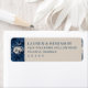 This return address label features a sophisticated design with a balanced layout, combining a dark blue floral pattern on the left and a light beige background on the right. The colour palette includes deep navy blue and soft cream, creating an elegant contrast. The classic serif typography adds a formal touch, making it perfect for weddings or special events. Customisable text fields allow personalisation, while the overall style exudes timelessness and refinement.