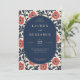 This elegant wedding invitation features a central oval frame surrounded by a vibrant floral border in shades of deep navy blue and coral red, creating a striking contrast against the white background. The design showcases stylized flowers and leaves arranged in a grid-like pattern, adding a decorative touch without overwhelming the text. With a vintage feel emphasized by serif typography, the layout is symmetrical and classic, conveying a formal and celebratory mood perfect for a sophisticated event. Customizable elements allow personalization for names, dates, and addresses, making it ideal for marking this special life moment.