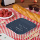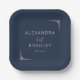 This elegant wedding plate features a minimalist design with a deep navy blue background, creating a sophisticated and modern look. The layout includes clean lines and geometric accents in an Art Deco style, enhancing the formal atmosphere. White text is arranged vertically, showcasing two names connected by a cursive "and," while smaller lettering displays the date below. The monochromatic colour palette emphasises clarity and focus, making it perfect for celebrating your special day with understated luxury.