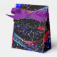 Perfect for the holiday season, this navy-black favour bag features glittering multi-coloured stars and lights along with gossmer streaks of colours - red, rose, pink, turquoise, teal, bright blue. You have a choice of four ribbon colours for the real ribbon at the top of the box.