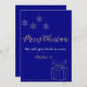 The design combines a luxurious deep–blue background, gold script lettering, delicate hanging snowflakes, and a minimalist line-art gift illustration.