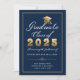 Announce your graduation in style with this elegant custom announcement card featuring a typography design with the words "Graduate Class of 20XX" accented by a faux gold graduate cap on an navy blue background with personalised text in white script. Designed by Susan Coffey.