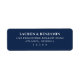 This return address label features a sophisticated, minimalist design with a deep navy blue background and crisp white text. The layout is clean and organised, utilising ample spacing to highlight the elegant serif typography that conveys formality and refinement. Perfect for formal occasions, this label combines simplicity and sophistication, making it ideal for weddings or other special events where clarity and elegance are essential.